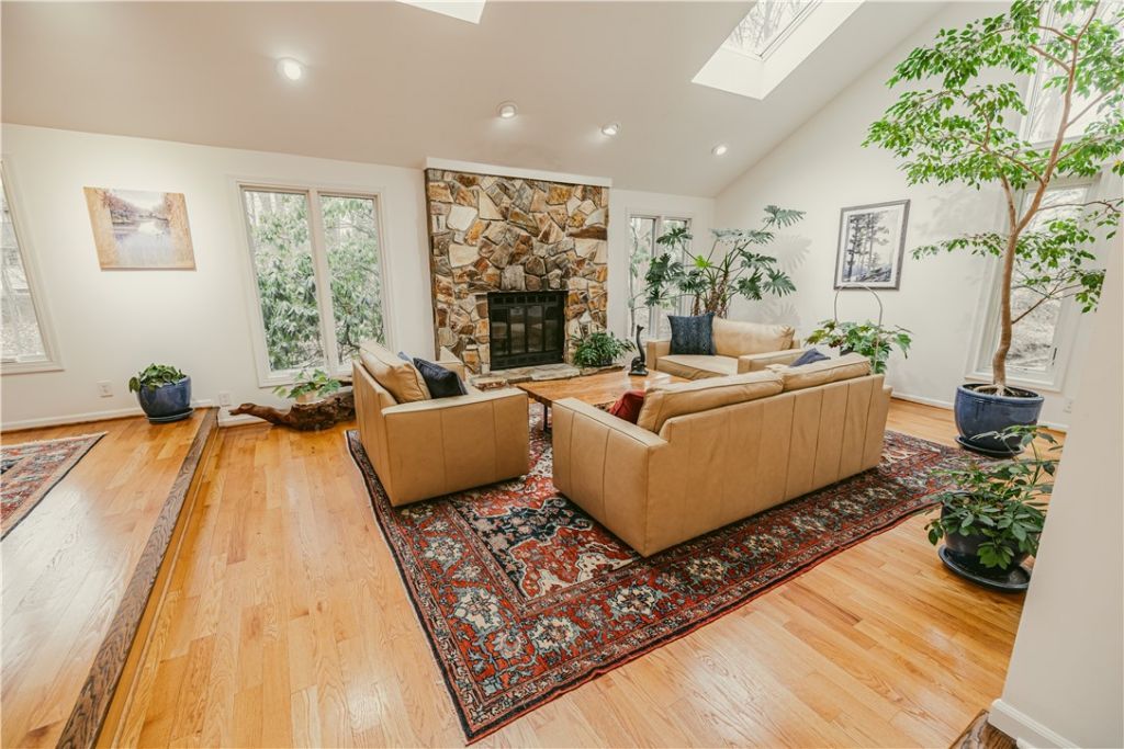 Welcome to 28 Shelter Creek Lane, a truly unique Fairport home where architecture, natural light, and thoughtfully designed spaces come together to feel refined and inviting. The open floor plan with living room and dining room is at the heart of the main level, featuring vaulted ceilings, skylights, and a wood-burning fireplace. The elegant kitchen is equipped with Sub-Zero appliances seamlessly integrated behind curly maple custom cabinetry and complemented by a central granite island. The adjacent eat-in area is skylit and spacious, and flows through glass doors onto a deck perched above a ravine and creek and a private fenced-in garden. The main floor also has an office that works well for remote work or everyday flexibility, a half bath, and a laundry room. The primary suite upstairs is replete with skylights, a spa-like bathroom with heated granite-tiled floors, and a generous walk-in closet. Two more bedrooms share a full bath. The walkout basement, with its own deck already wired for a hot tub, has a home theater with surround sound, an additional finished room ideal for a gym, studio, or guest room, and a large unfinished area perfect for storage. The two-car garage has EV charging. Owned solar panels support energy efficiency. The grounds have a low-maintenance woodland garden with automatic underground watering throughout and dozens of rare specimen trees and groundcovers. All offers to be reviewed on Monday, March 23rd at 2pm.