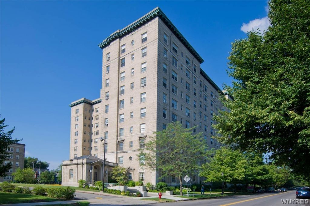 The Park Lane condominiums is home to this beautiful two bedroom two bath residence. The sixth floor offers great light and tree top views. Hardwood floors throughout, this apartment lives like a house. With a foyer leading to a spacious living room, there are many built-ins and an artificial fireplace (NRTC) with a commanding mantle. The formal dining room is a great size and leads to the updated chefs kitchen with white cabinetry, new appliances, granite countertops and space for a small table. There is also a butlers pantry which leads to the laundry room and the washer and dryer are included. The primary bedroom has a large closet and an en suite full bath. The second bedroom is a good size and there is an updated second bath with a walk-in shower which is wheelchair accessible. The building has a large library with efficiency kitchen, a work out room and there is a private storage unit included. There is a beautiful courtyard available for the residents use. The Park lane has a 24 hour concierge and valet parking. All utilities are included in the HOA. The Delaware District location is walkable to Elmwood Ave shops and restaurants and Delaware Park.